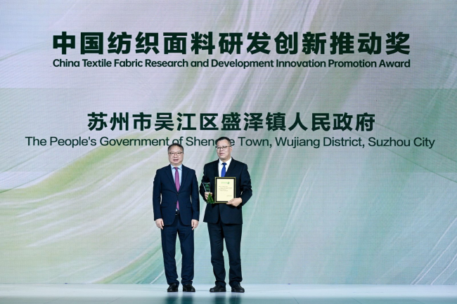 自2015年首次合作以来,中国生态环保面料设计大赛与盛泽携手八载,不仅为行业绿色转型构建了高水平的交流展示平台,更以务实行动推动了产业可持续发展进程。为表彰盛泽镇人民政府在推动纺织面料研发创新方面的突出贡献,大赛组委会特授予其“中国纺织面料研发创新推动奖”。