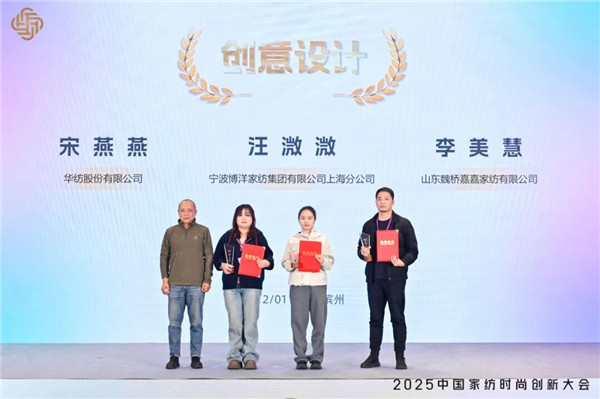 竞赛副总裁判长、江南大学教授、博士生导师、高级家纺设计师张毅为“创意设计”单项奖第一名宁波博洋家纺集团有限公司上海分公司汪溦溦、第二名山东魏桥嘉嘉家纺有限公司李美慧、并列第二名华纺股份有限公司宋燕燕颁奖。