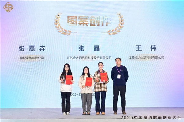 中国财贸轻纺烟草工会纺织工作部副部长周晨为“图案创作”单项奖第一名江苏金太阳纺织科技股份有限公司张晶、第二名江苏悦达生活科技有限公司王伟、第三名愉悦家纺有限公司张嘉卉颁奖。