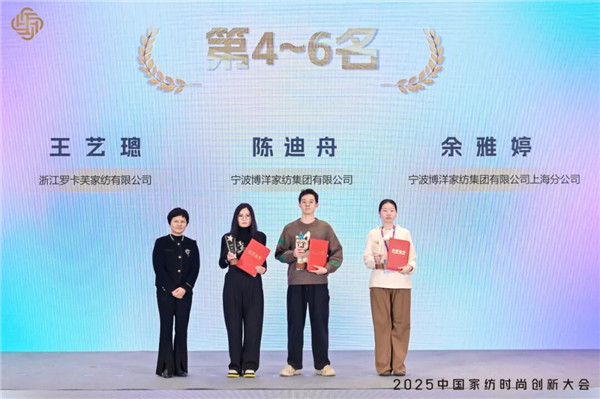 朱晓红为全国决赛第四名宁波博洋家纺集团有限公司陈迪舟、第五名宁波博洋家纺集团有限公司上海分公司余雅婷、第六名浙江罗卡芙家纺有限公司王艺璁颁奖。